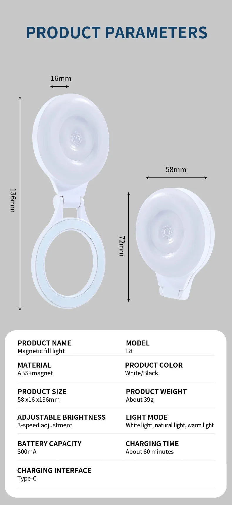 SPECIFICATIONS• Light modes: White / Natural / Warm |